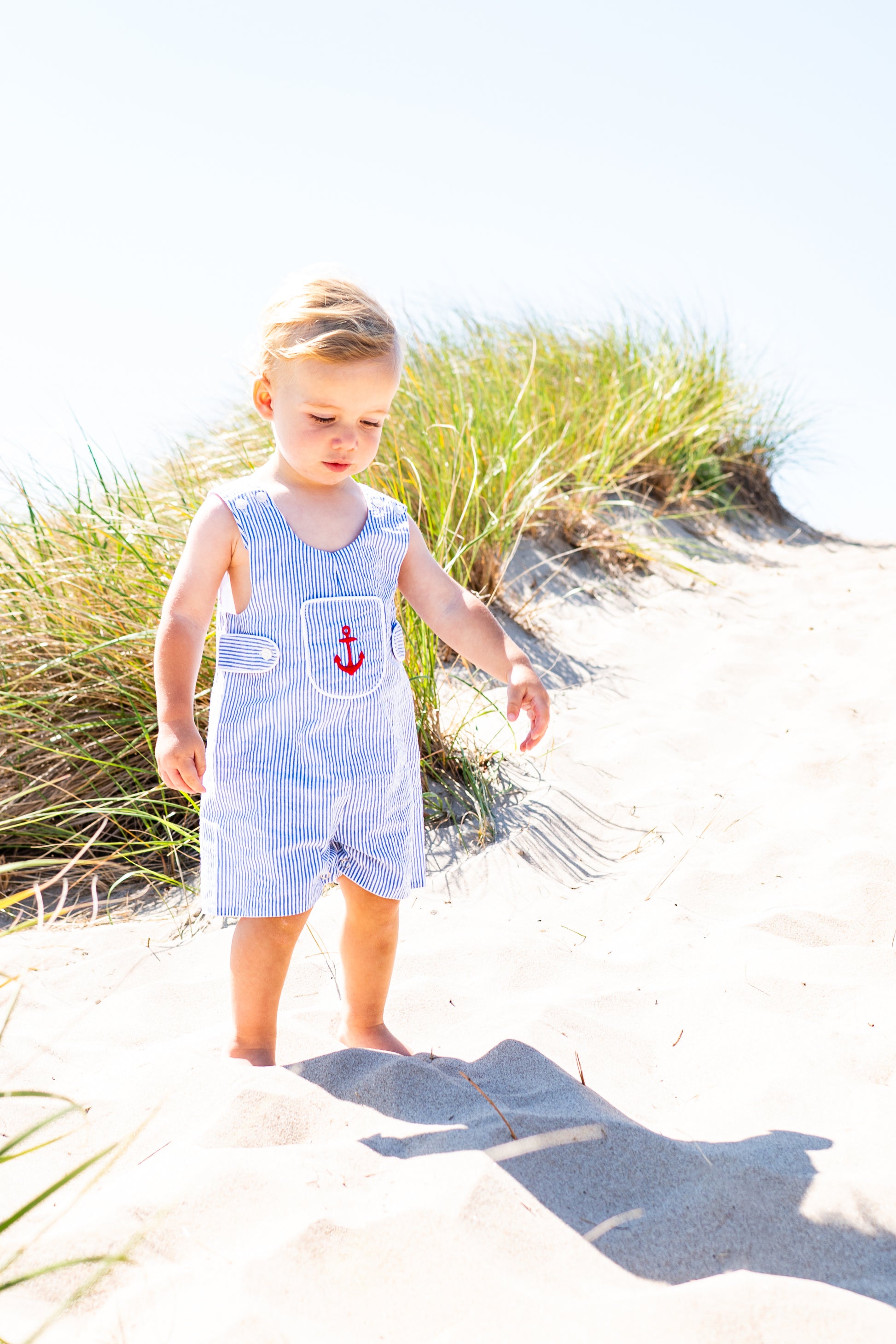 A classic coastal look for little boys, this blue and white seersucker Jon Jon is thoughtfully designed with timeless details and everyday comfort in mind. Featuring a sweet embroidered red anchor on the front pocket, this piece adds a nautical touch that feels both playful and heirloom-worthy.