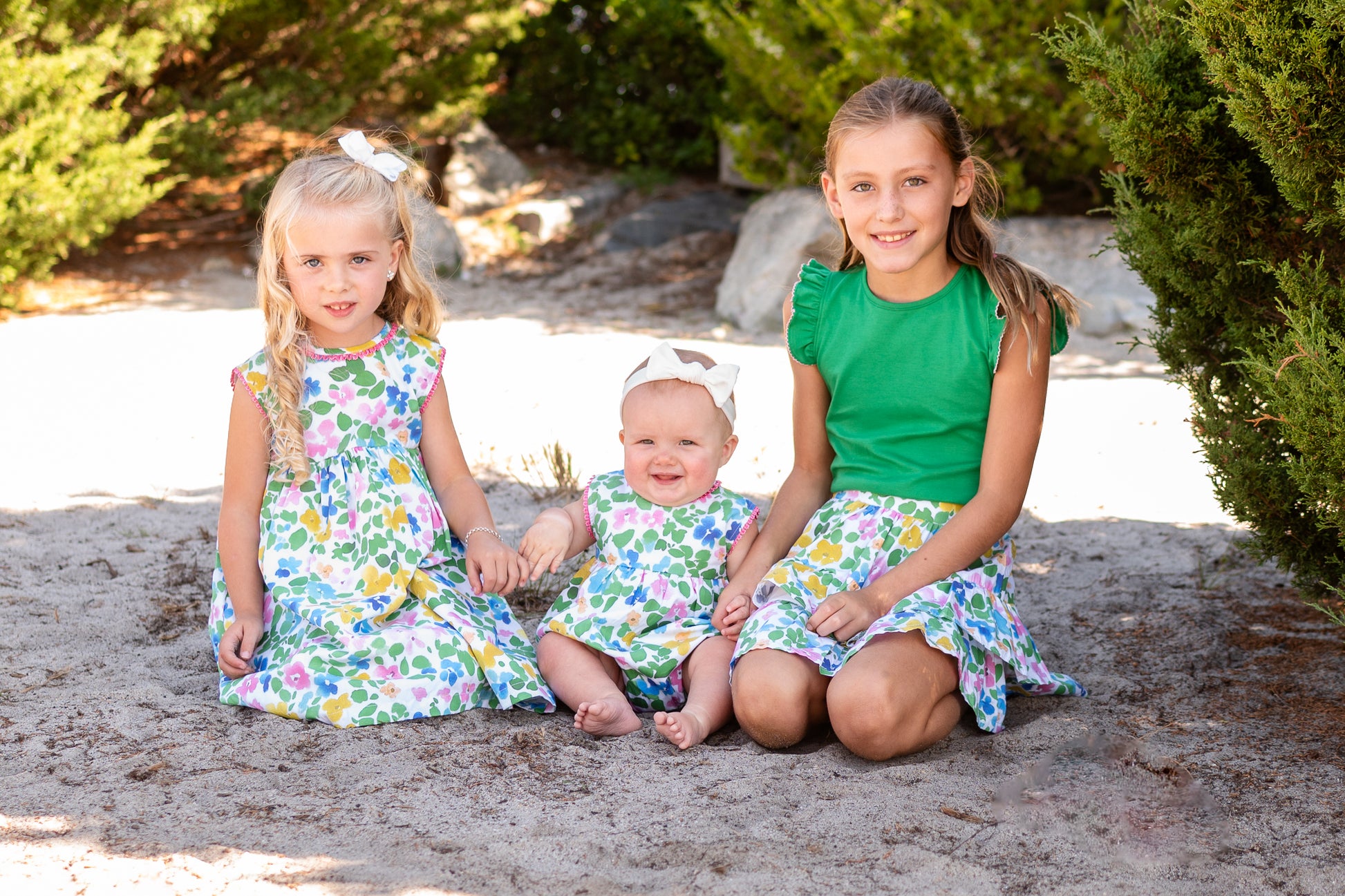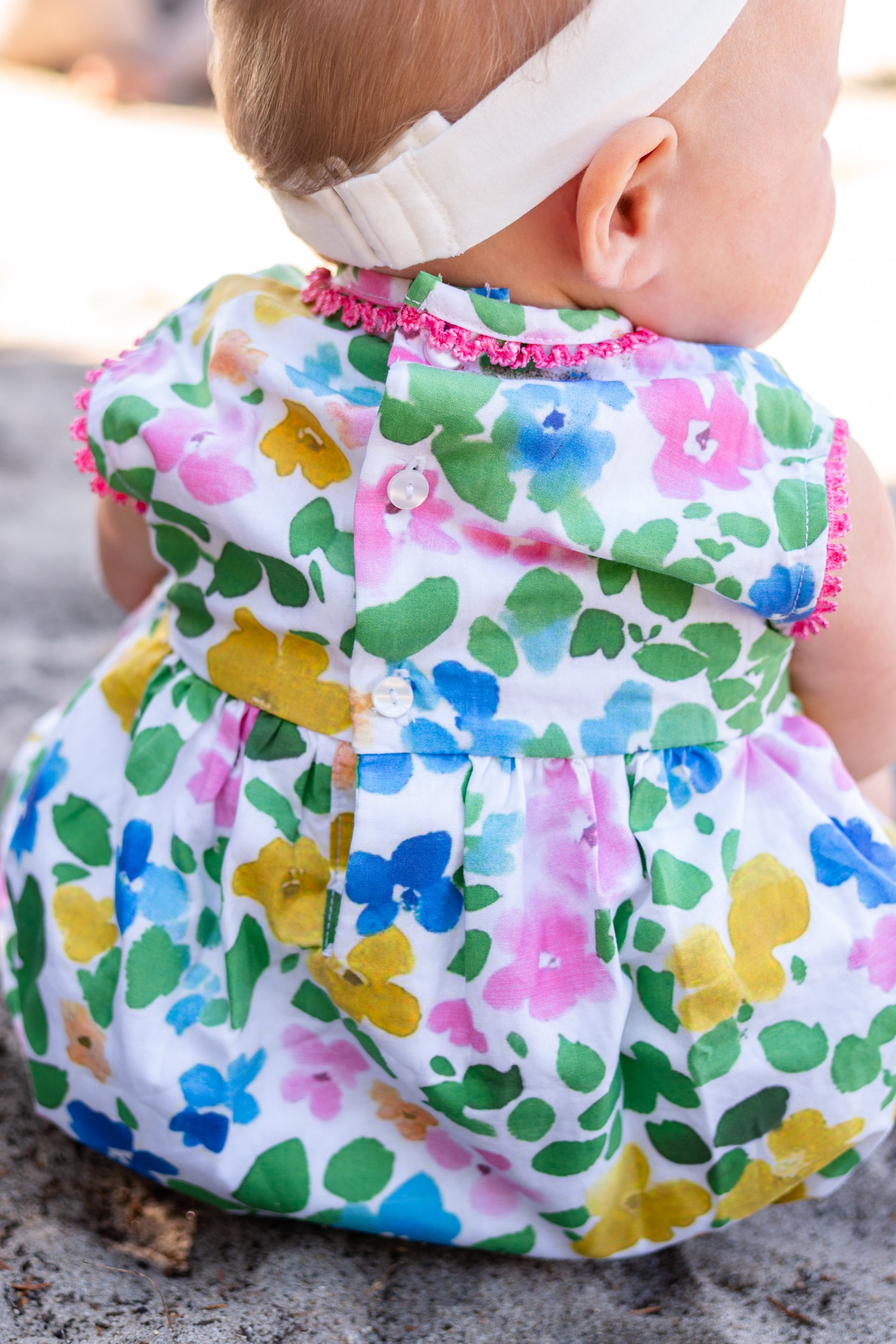Bright watercolor floral bubble with pink trim detail. Match with our Quinn dress and skirt. Fit is true to size.