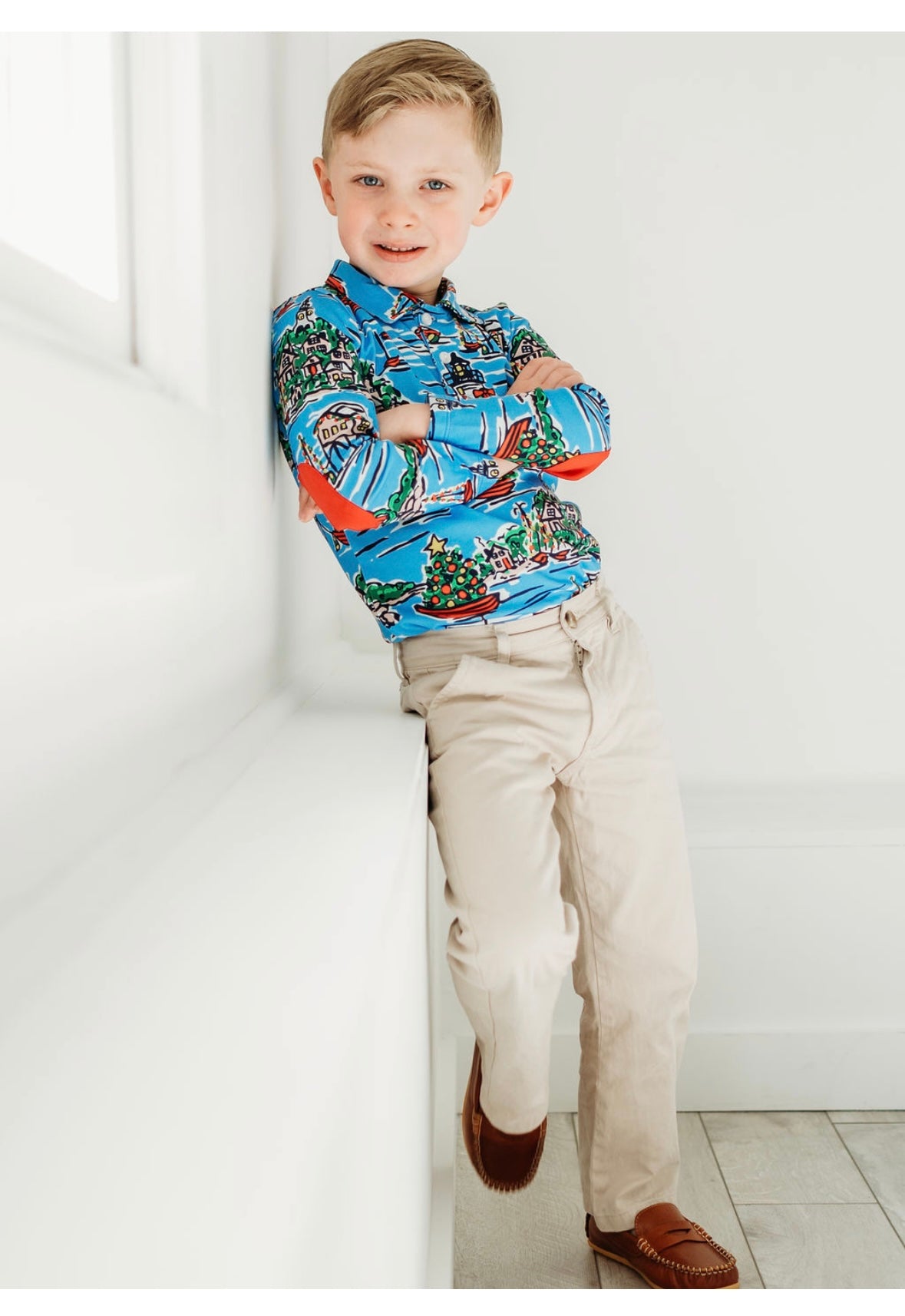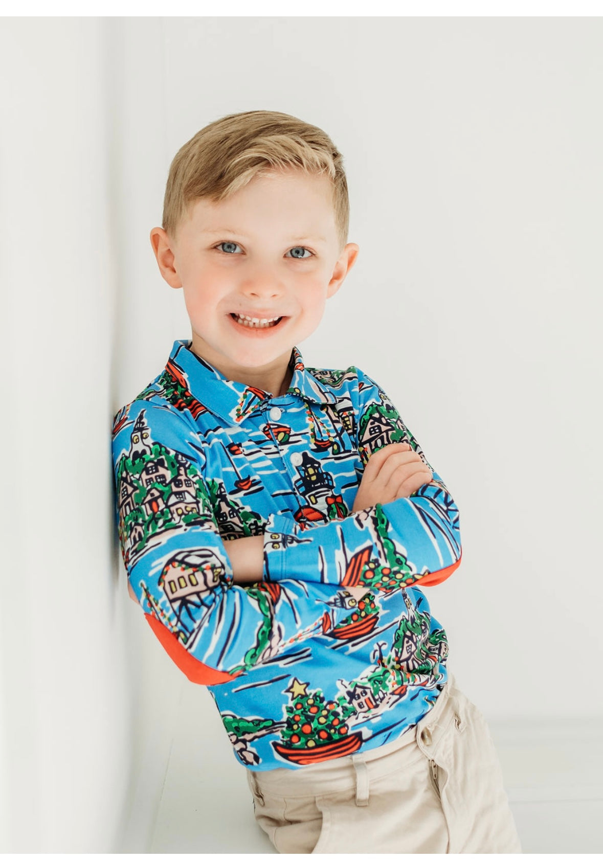 Our Harborside holiday boys shirt is perfect for the holiday season! This shirt has cute elbow patches and a festive holiday print! Fit is tts.
