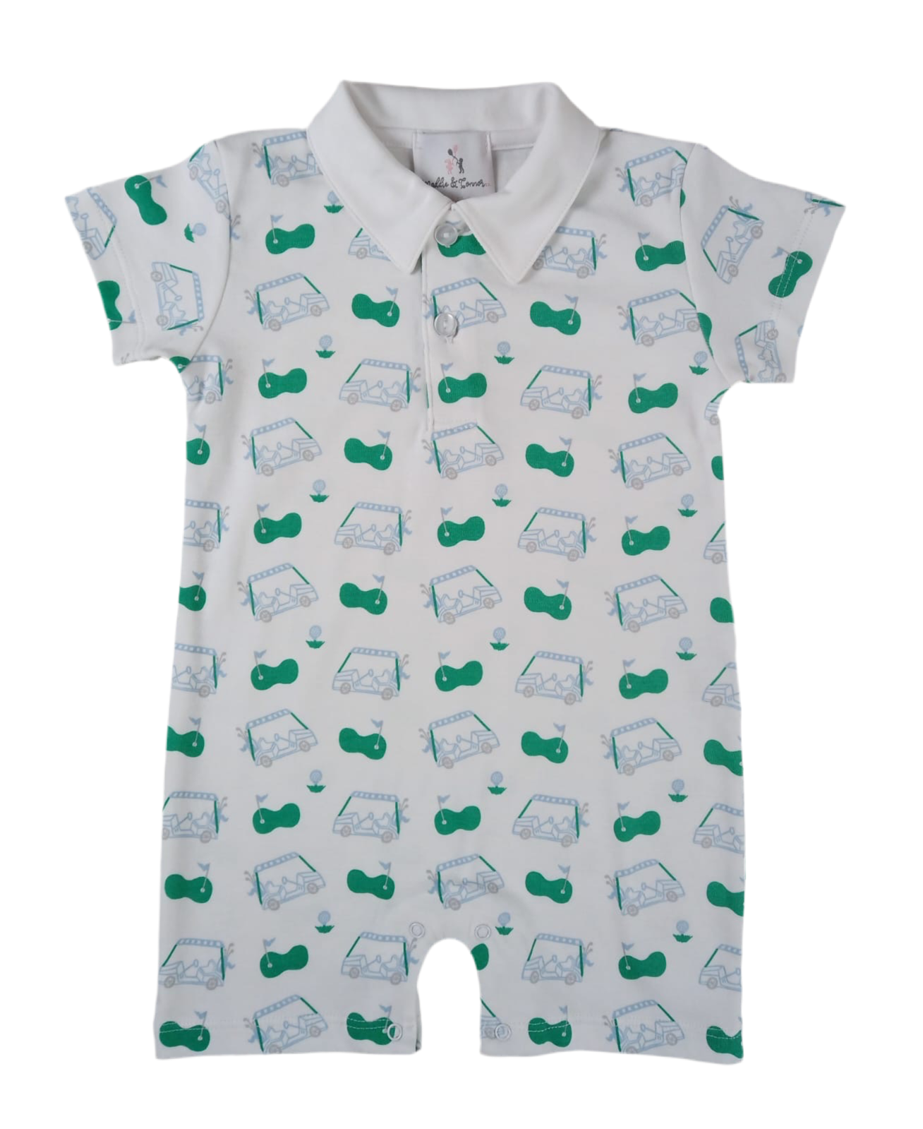 Our Tee Time boys romper is perfect for spring and summer days at the links! Our pima romper will have him cool and comfortable on and off the course! Fit is tts. Ships end of March- we promise your order will be well worth the wait!