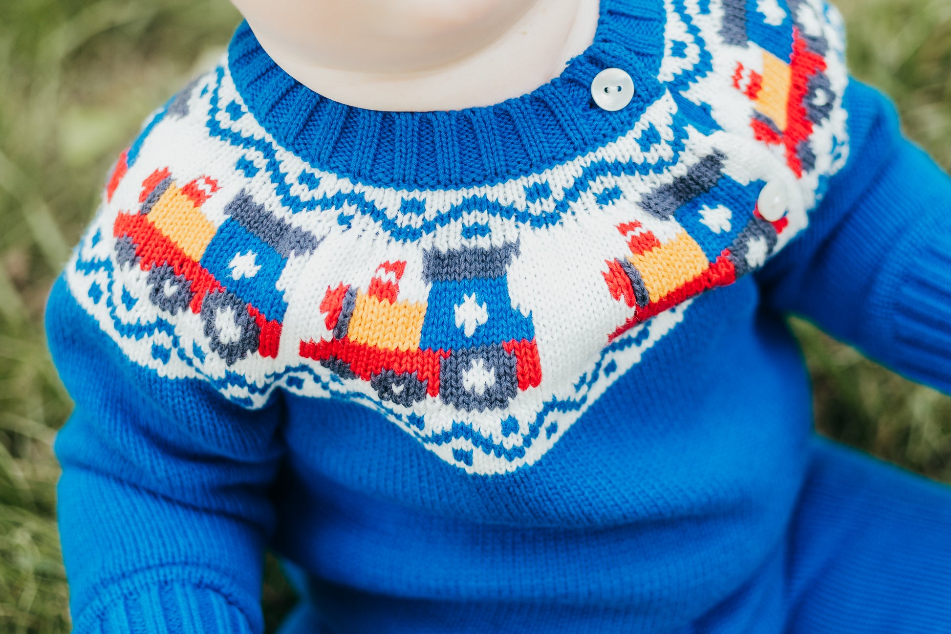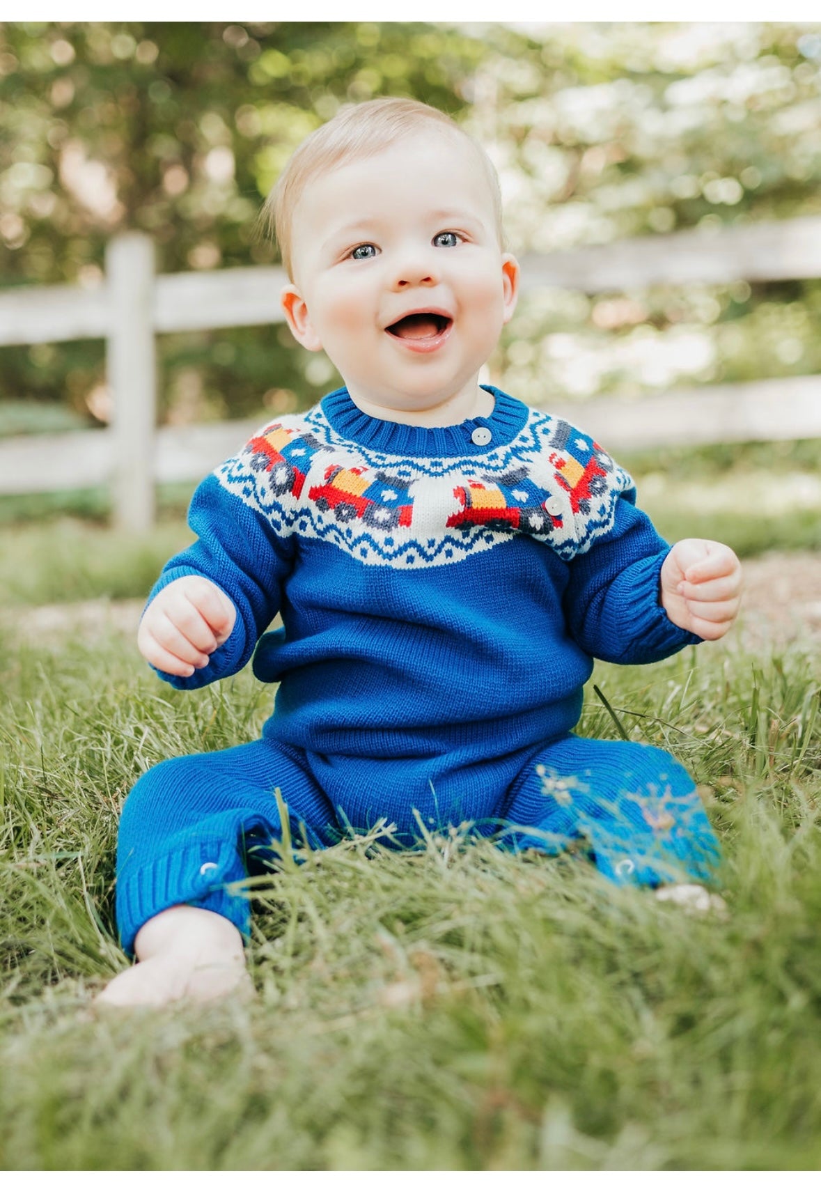Our train romper will have him looking cute and cozy this fall and winter! Fit is true to size.