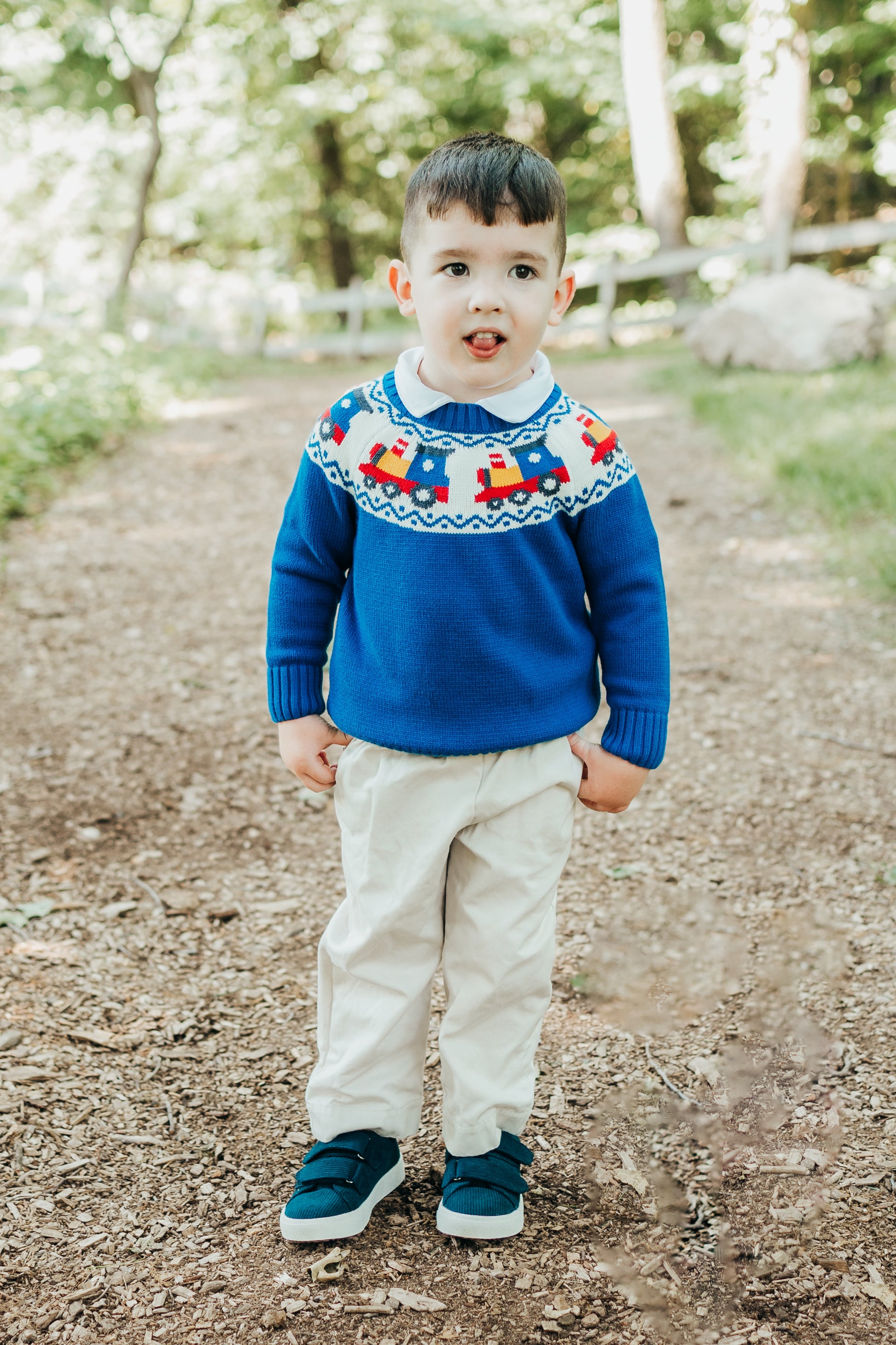 Our boys train sweater will have him looking cozy and cute for fall and winter days! Fit is true to size.